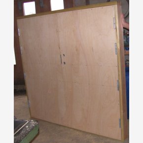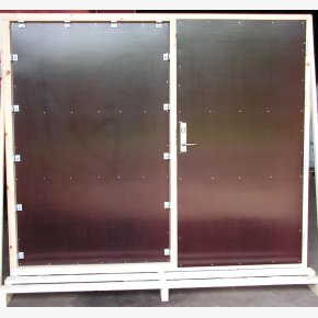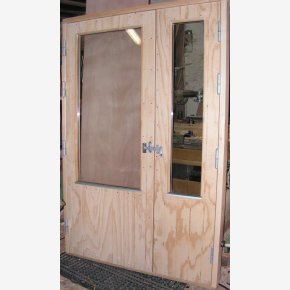 Dobbelt virkende Svingdør ( saloon dør ) i Massiv Eg, med polycarbonat " glas " og rustfri sparkeplader, special produceret for og leveret til KBH. Zoo. Giraffens Nye Hus.