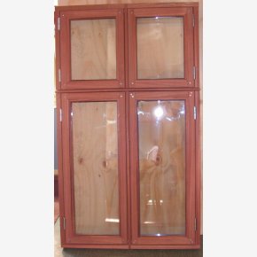Dobbelt virkende Svingdør ( saloon dør ) i Massiv Eg, med polycarbonat " glas " og rustfri sparkeplader, special produceret for og leveret til KBH. Zoo. Giraffens Nye Hus.
